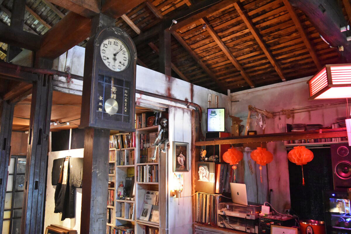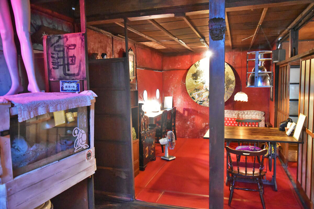 店内に足を踏み入れると、薄暗い照明の下に、どこか懐かしくも非現実的な空間が広がります。昭和レトロな家具や、見たことのない古道具が隙間なく並び、壁には前衛的な絵画が無造作に掛けられています。天井からはクラゲを模したランプが柔らかな光を放ち、棚やテーブルの隅々には、いつの間にか「目」がひっそりと潜んでいます。