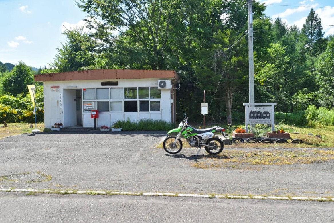 次に訪れたのは、終着駅手前の万字駅。万字線の名前の由来となったこの場所には、かつて中規模の駅舎と貨物施設がありました。現在、旧駅舎は「万字仲町簡易郵便局」として再利用されており、ホームや階段の一部が今も残っています。