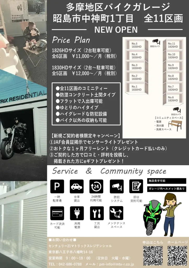 センチュリー21マトリックスレジデンシャルを運営する株式会社マトリックスレジデンシャルは、手軽に安心して利用できるバイクガレージ「多摩地区バイクガレージ 昭島市中神町」を、2023年1月末にオープンする。稲葉製作所のガレージを採用し、庫内には前輪をロックするチェーンロックバーやセキュリティーバーを標準装備。可動式ヘルメット棚の設置に加え、フルフラット仕様となっている。また、セキュリティーに特化し、防犯カメラやセンサーライトを導入し、共用電源、専用水道、工具貸し出しも可能である。さらに、他社コンテナから同社へ契約変更の場合、1ヶ月分の使用料・ラダーレール付きのトランスポーターの貸出が無料となるキャンペーンや、JAF会員証提示で新規契約時に電池式センサーライトプレゼントされるキャンペーンなど、特典も充実。気になるユーザーはぜひこの機会にバイクガレージを利用してみよう。