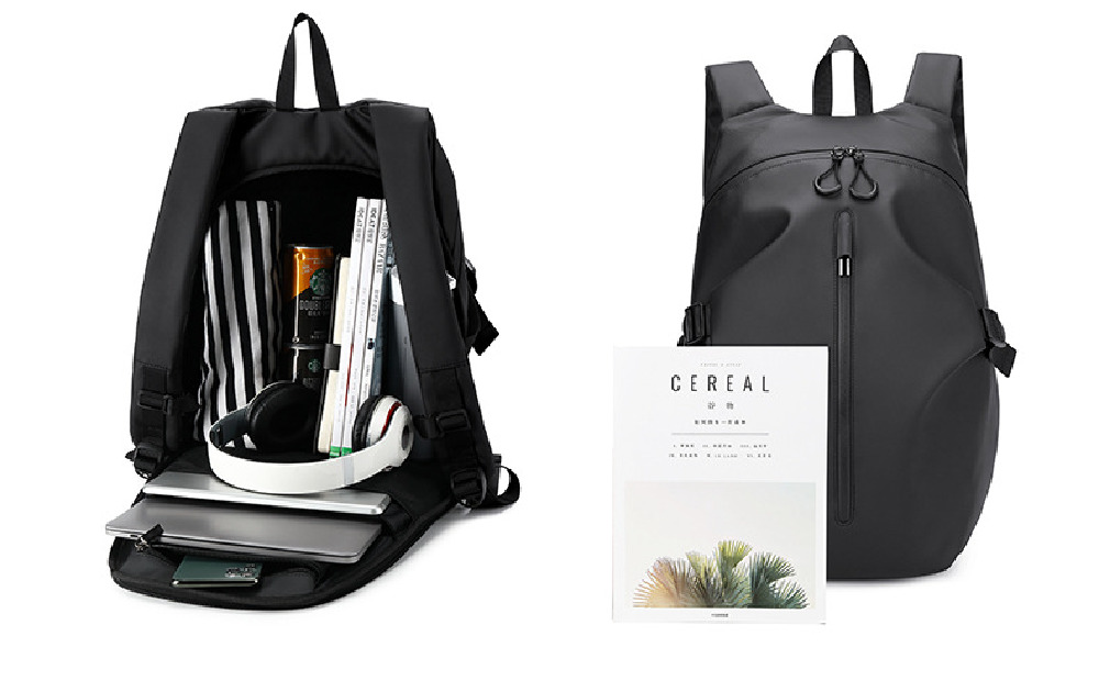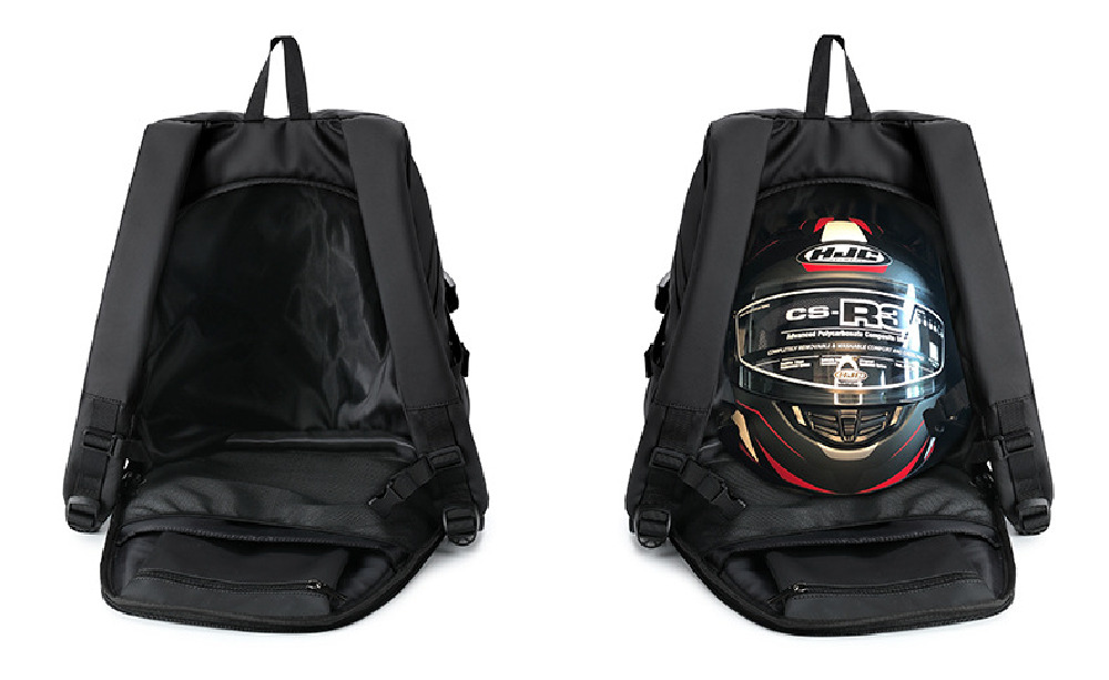 バッグの中にはパソコンやiPadが収納できる2層式のポケットがあります。ヘルメットバッグの右側には、鍵、イヤホン、水筒などのアイテムを収納できます。背面には取り出しやすいジッパーポケットがあり、財布やスマートフォンなどを収納できます。