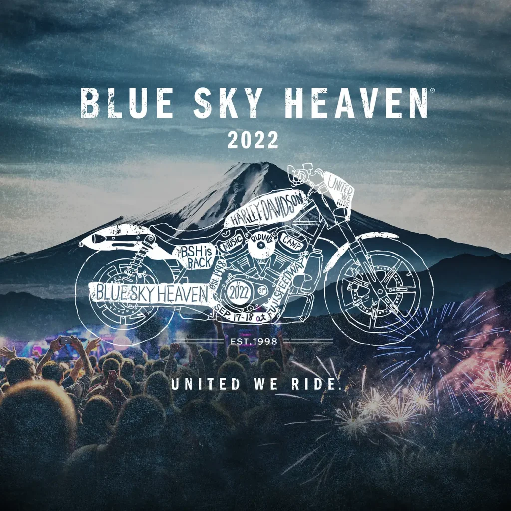 「BLUE SKY HEAVEN」は、ハーレーダビッドソンジャパン株式会社が主催し、今年で21回目の開催となる、モーターサイクル、音楽ライブ、キャンプが融合した日本最大級のオートバイイベントです。2日間通じ約1万人が富士の麓に集い、日本全国から集まったハーレー約1,000台がサーキットを駆け抜けるパレードや、プロライダーによるエクストリームライディングショー、打ち上げ花火「BLUE SKY FIRE WORKS」など、様々なイベントをお楽しみいただけます。4年ぶりの開催となる今年は「ミュージック&ショッピングエリア」と「モーターサイクルアトラクションエリア」の2つのメインエリアを中心に、サーキットプログラムや広大なキャンプエリアを設置し、ハーレーオーナーでなくても楽しめるオープンな滞在型イベントになっています。