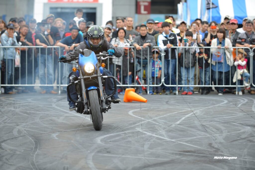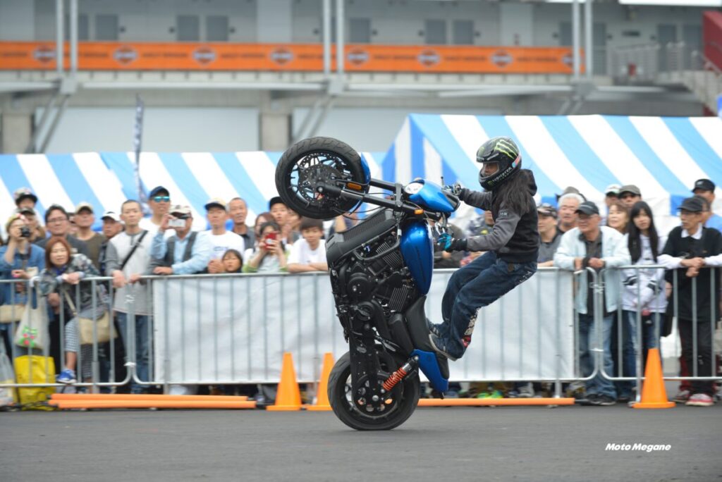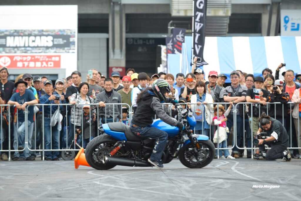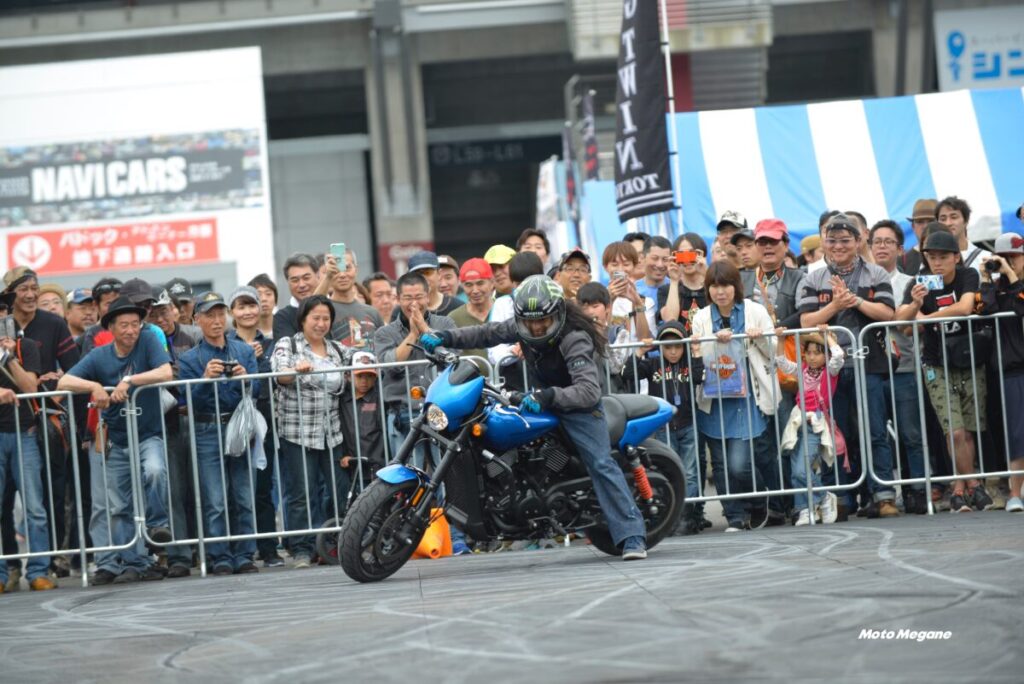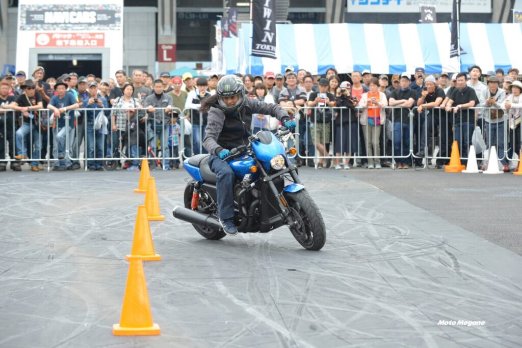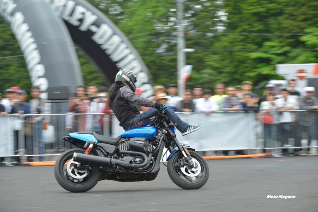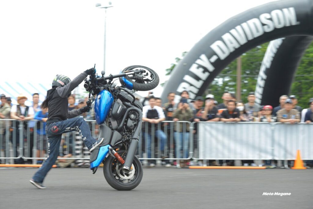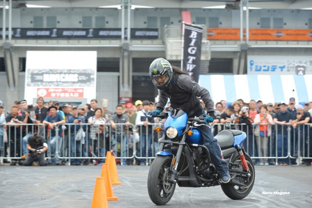 世界的プロライダーらによるスタントやデモランショーも見どころの一つ。低く長いハーレーダビッドソンを手足のように扱う走りは驚きの連続だ!
