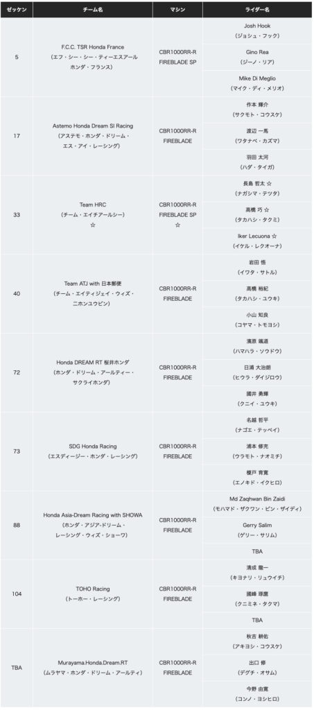 Hondaは、三重県・鈴鹿サーキットにて、8月7日(日)に決勝レースが行われる「FIM※1世界耐久選手権シリーズ(以下、EWC)“コカ・コーラ”鈴鹿8時間耐久ロードレース第43回大会(以下、鈴鹿8耐)」に参戦する主なHondaチームの体制を決定しました。