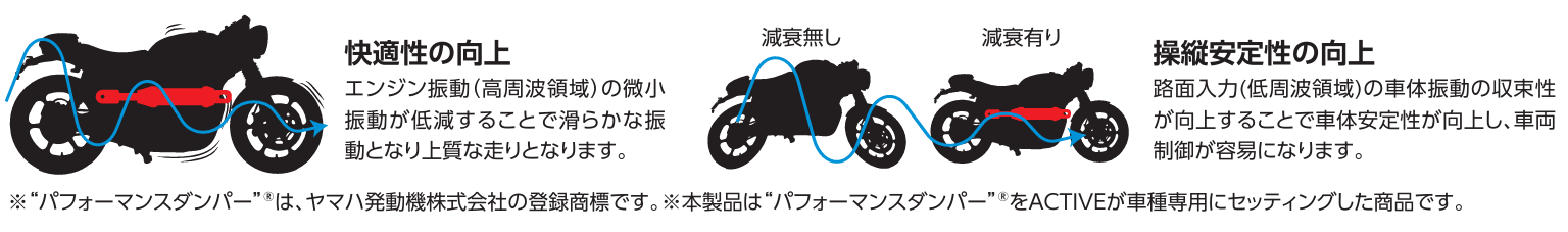 共振を抑えて乗り心地、ハンドリングを向上させ、特にツーリングなどの長距離移動で効果を発揮する車種専用車体制振ダンパー。車体フレームに専用のステーを装着するだけで、ワンランク上の上質な乗り心地を提供します。