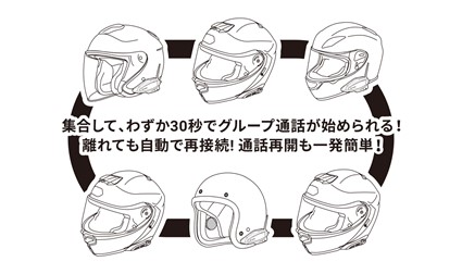 「SX1」同士はもちろん、「SB6XR」「SB6X」「ONE」の 4 機種をふくめたグループであれば、最大6 人まで通話が可能です。B1 ボタンと B2 ボタンを同時に押すだけで、スムーズに会話を始めることができます。