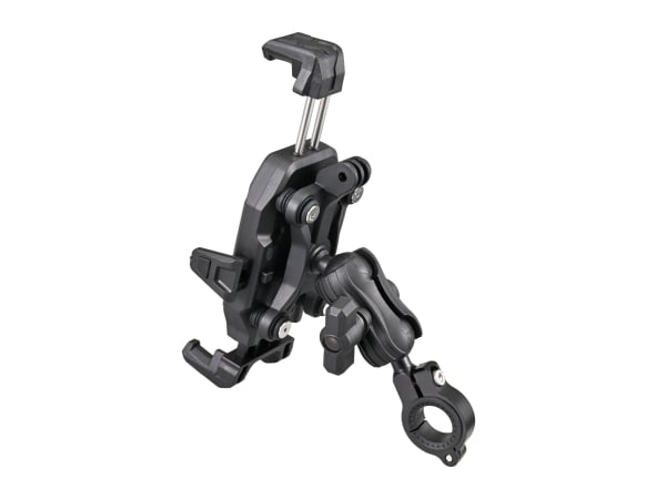 ボールジョイント機構により、自由度の高い位置調整が可能なスマートフォンホルダー。別売のオプション品と組み合わせることで様々な箇所へ取り付け可能。マウントとホルダー間に設けた振動吸収ダンパーと、アーム固定部の振動吸収クッションでスマホを振動から守ります。上下左右から5つの爪でスマホをガッチリ固定するから安心です。