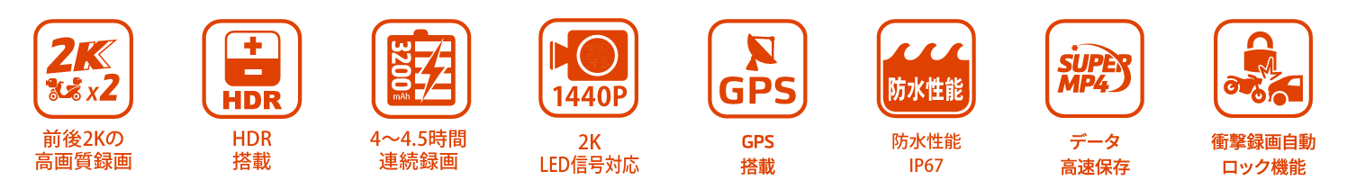 ・主な機能:前後2Kの高画質録画 / HDR搭載 / 4〜4.5時間連続録画 / 2K LED信号対応