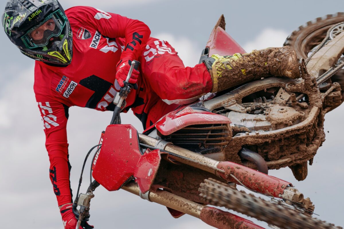 2025年5月26日 ボルゴパニガーレ(イタリア、ボローニャ) – ボルゴパニガーレのドゥカティ・ファクトリーで、ドゥカティ史上初のモトクロス・バイク、新型デスモ450 MXの生産が開始されました。最初のデスモ450 MXが工場からラインオフした直前の週末には、モトクロス世界選手権(MXGP)のフランス・グランプリで、ジェレミー・シーワーが2度目の表彰台を獲得しました。生産開始の祝賀イベントには、過去に9度のワールド・チャンピオンを獲得し、このバイクの開発に貴重な経験を提供したトニー・カイローリと、イタリア選手権で初勝利と年間タイトルを獲得したアレッサンドロ・ルピーノが出席しました。