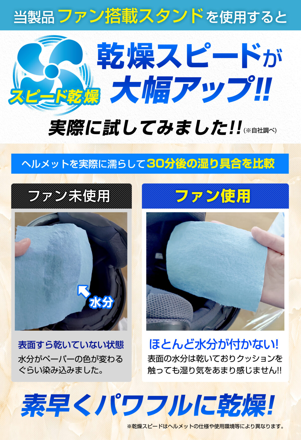 との思いで生まれたのが乾燥ファン搭載ヘルメットスタンドです。