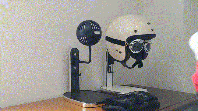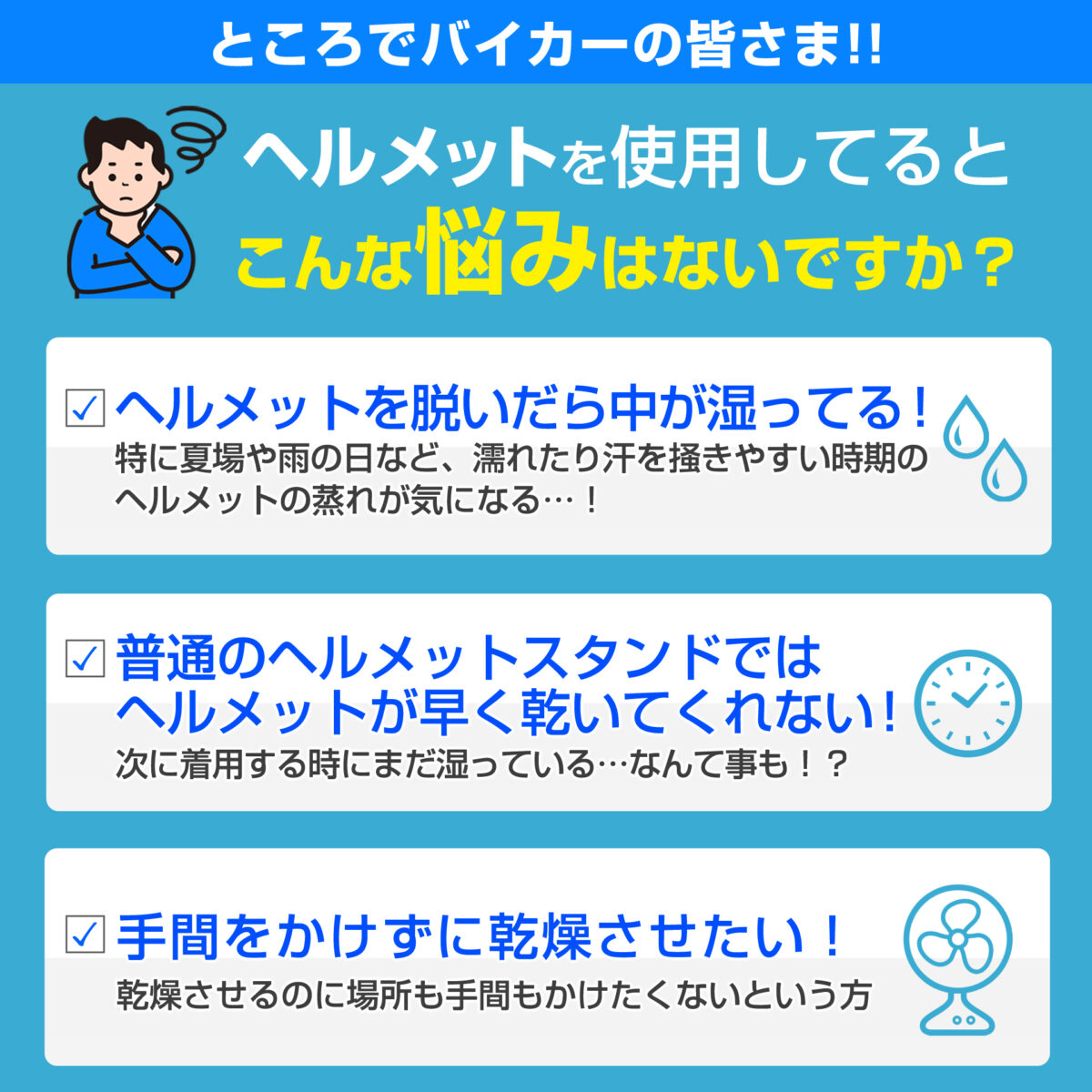 時間がないバイカーにオススメ!蒸れたヘルメットを放置すると悪臭の原因となるため、乾燥ファンで使用後のヘルメットを乾燥。USB接続でファンが作動。実用性とインテリアを兼ね備えたヘルメットスタンドが誕生。