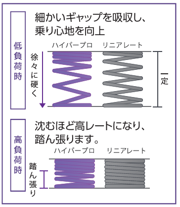 独自の『コンスタントライジングレート』スプリングは動きに追従してバネレートが常に変化。高負荷のコーナリングや急ブレーキ時も踏ん張る力を併せ持ちます。