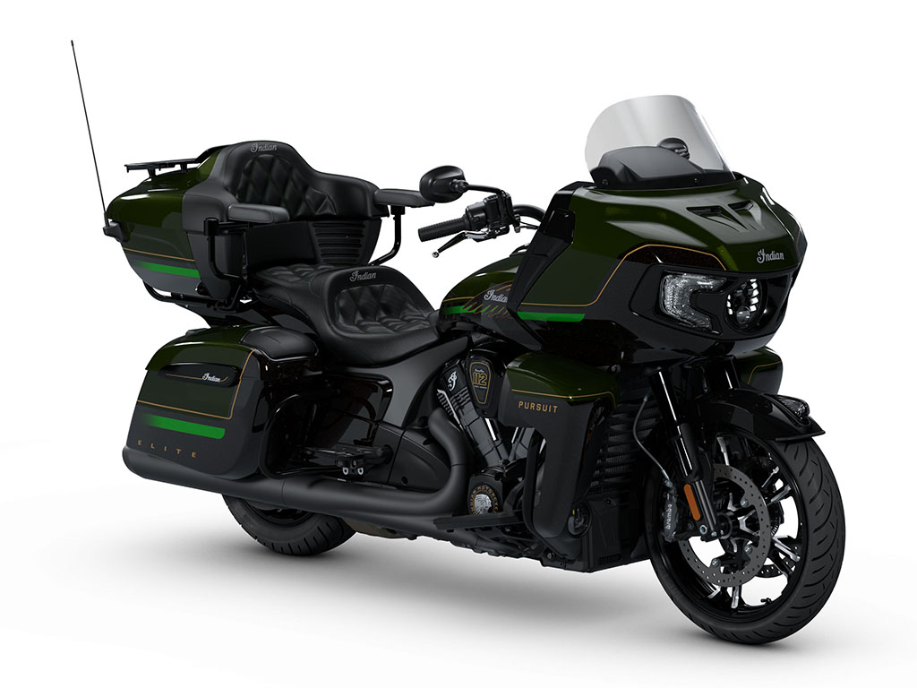 インディアン パースート エリートは、1916年にアメリカ陸軍向けに20,000台のパワープラスエンジン搭載車両を生産した歴史からスタイルのインスピレーションを得ています。この限定版ツーリングバイクは、ブラックキャンディとブラックフォレストキャンディの仕上げが施された3色ペイントを採用し、手描きのチャンピオンシップゴールドのアクセントがその芸術性を高めています。このカスタムペイントは、プレミアムブラックダークホースフィニッシュによってさらに引き立てられており、インディアン パースート エリートに洗練された注目を集めるスタイルを与えています。また、各モデルには、パワープラス112エンジンカバーやシリアルナンバーがあしらわれたセンターコンソールを含むエリート専用のバッジが特徴的に施されています。