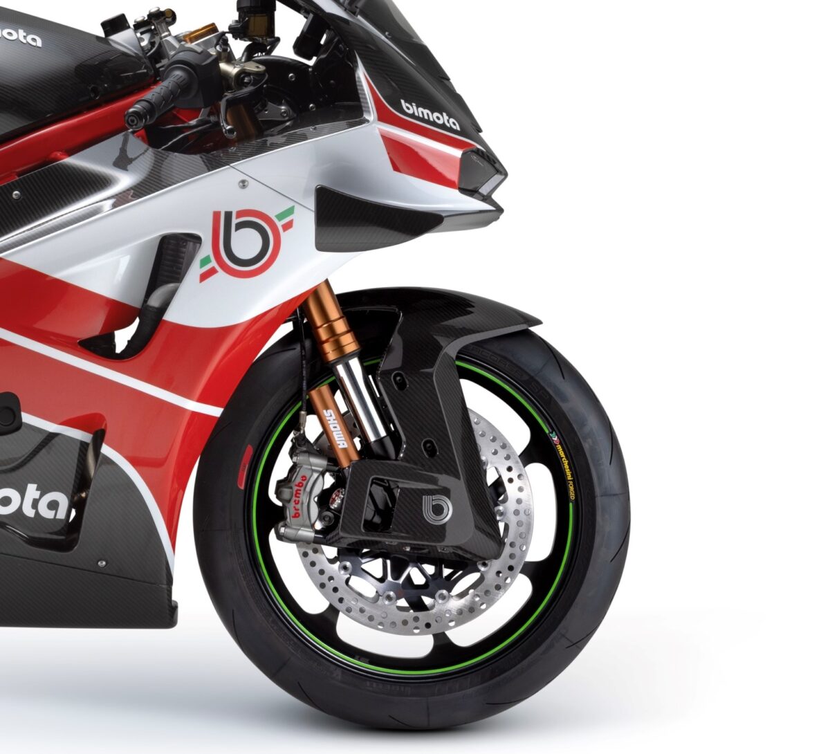 bimotaの職人がその手で仕上げた、美しい塗装を施されたカーボンファイバー製フェアリングには、近年のレーストレンドである、ダウンフォースを得るためのウイングレットを装備。専用のECUが車両速度とブレーキ作動を監視し、ケーブルとサーボモーターを介してウイングレットを自動的に調整。ブレーキングやコーナー進入、中間コーナーで最適なダウンフォースを発揮し、ホイールリフト抑制などの効果をもたらします。