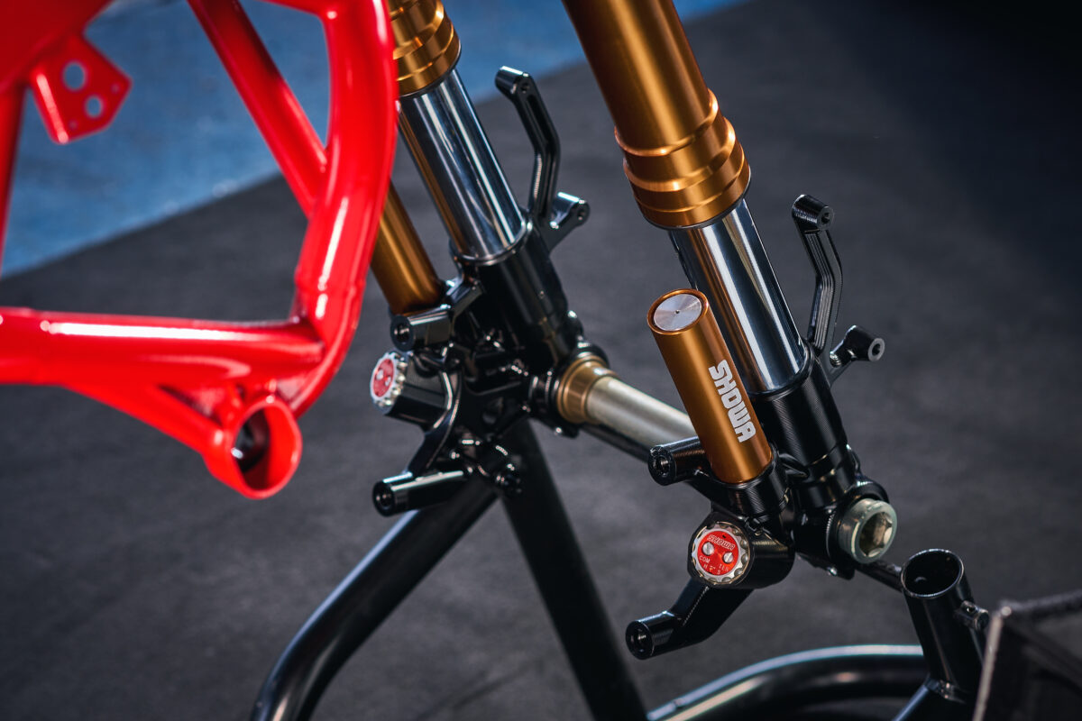 サスペンションはShowa製ø43mmBFFフロントフォークと、BFRC liteリヤショックを備え、リヤショックは垂直に配置することで、理想的な路面追従性を実現。上部のエキセントリックシャフトにより15mm上下に調整が可能となっています。