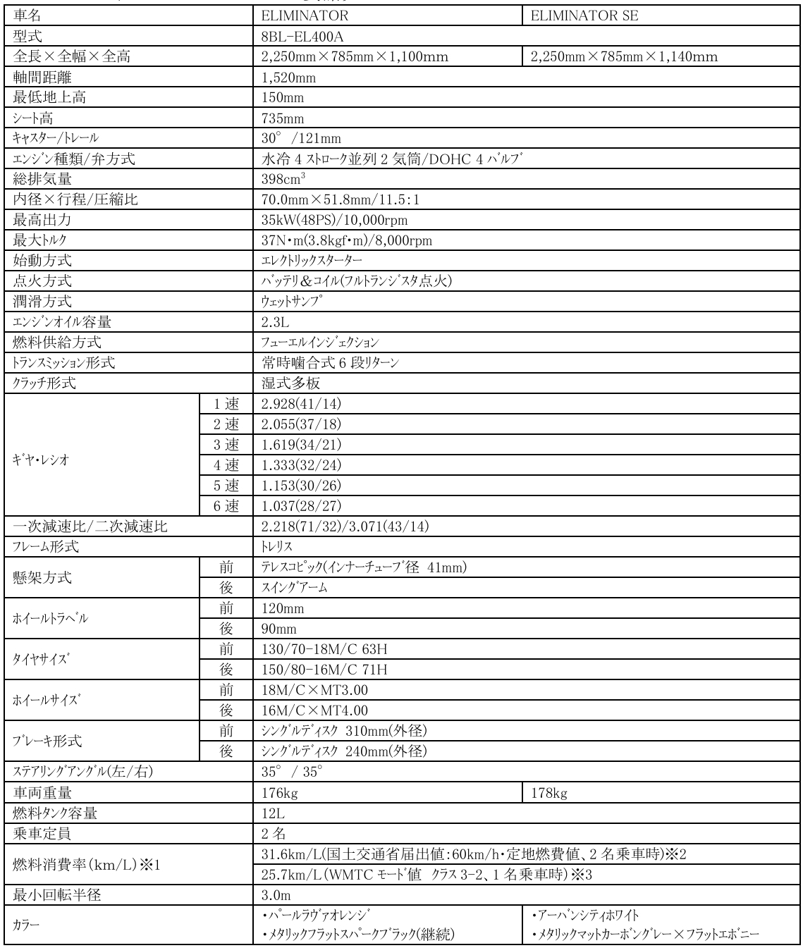 ELIMINATOR / ELIMINATOR SE 主要諸元