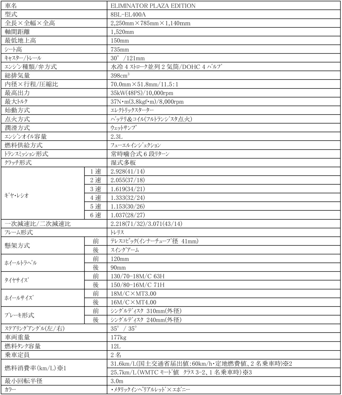 ELIMINATOR PLAZA EDITION 主要諸元