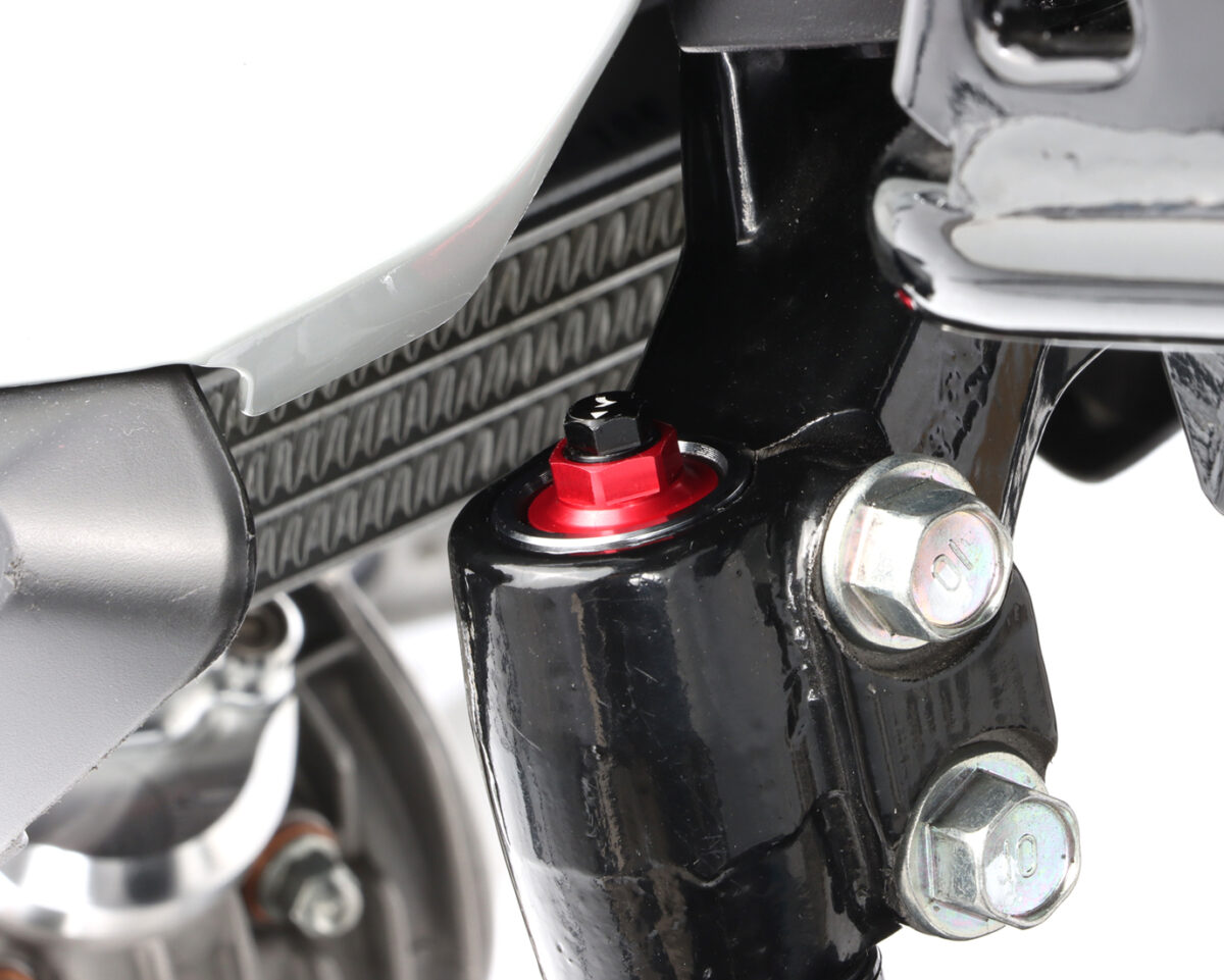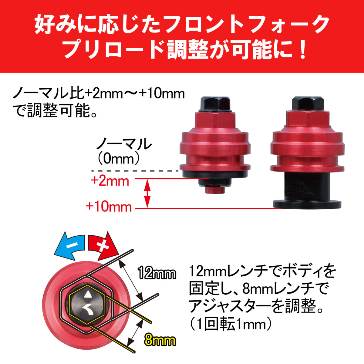 状況に応じた足周りのセッティングや、リヤショック交換後のフロントフォークのセッティングが可能。フロントフォークスプリングのプリロードの調節が可能になるアジャスターです。