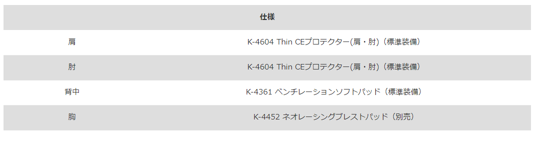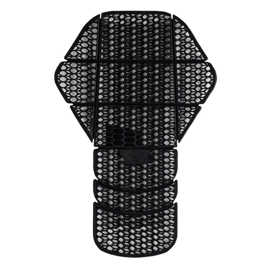 より風を通し、脊椎を保護する中心部は硬度を高く保ちつつ周辺部は柔らかい構造を実現しています。さらに何分割かの関節構造も採用し、通気性も持ち併せています。 これにより高いプロテクト性と快適性/身体への追随性を高い次元で両立させています。