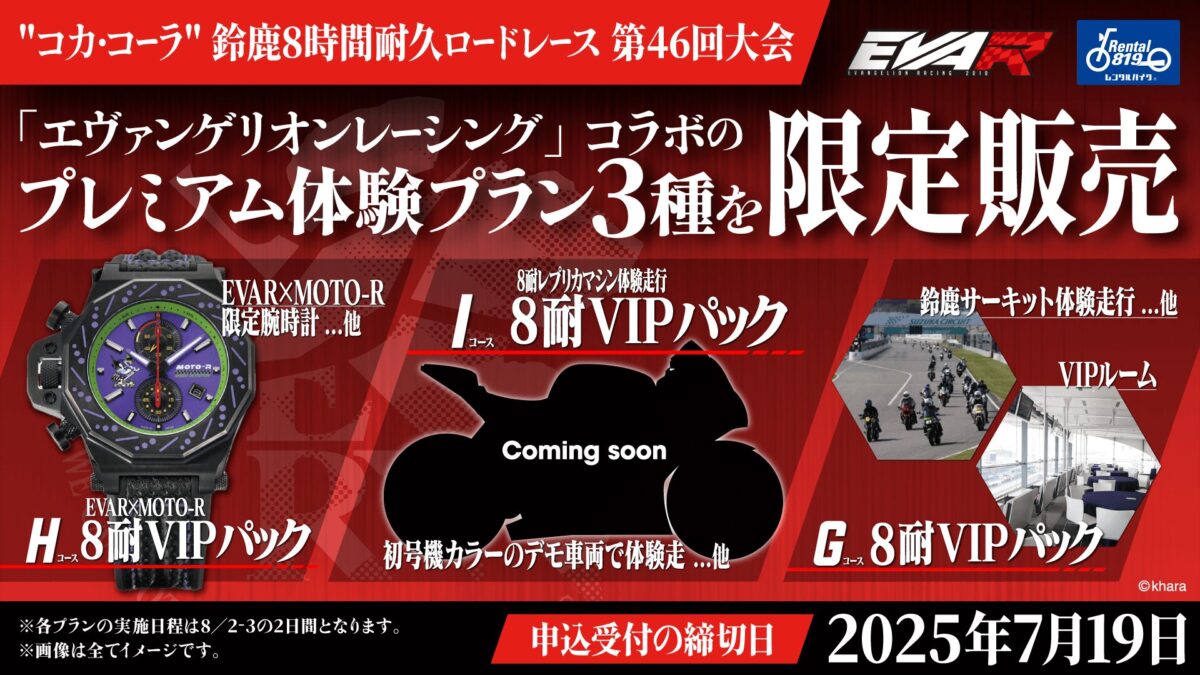 これに伴い、2025年8月に鈴鹿サーキットで開催される国内最高峰のバイクレース「FIM世界耐久選手権 “コカ・コーラ” 鈴鹿8時間耐久ロードレース(通称:鈴鹿8耐)」にて、エヴァレーシングの世界観とレースの熱狂を“リアルに体感”できる【特別体験プラン】を数量限定でご用意いたしました。