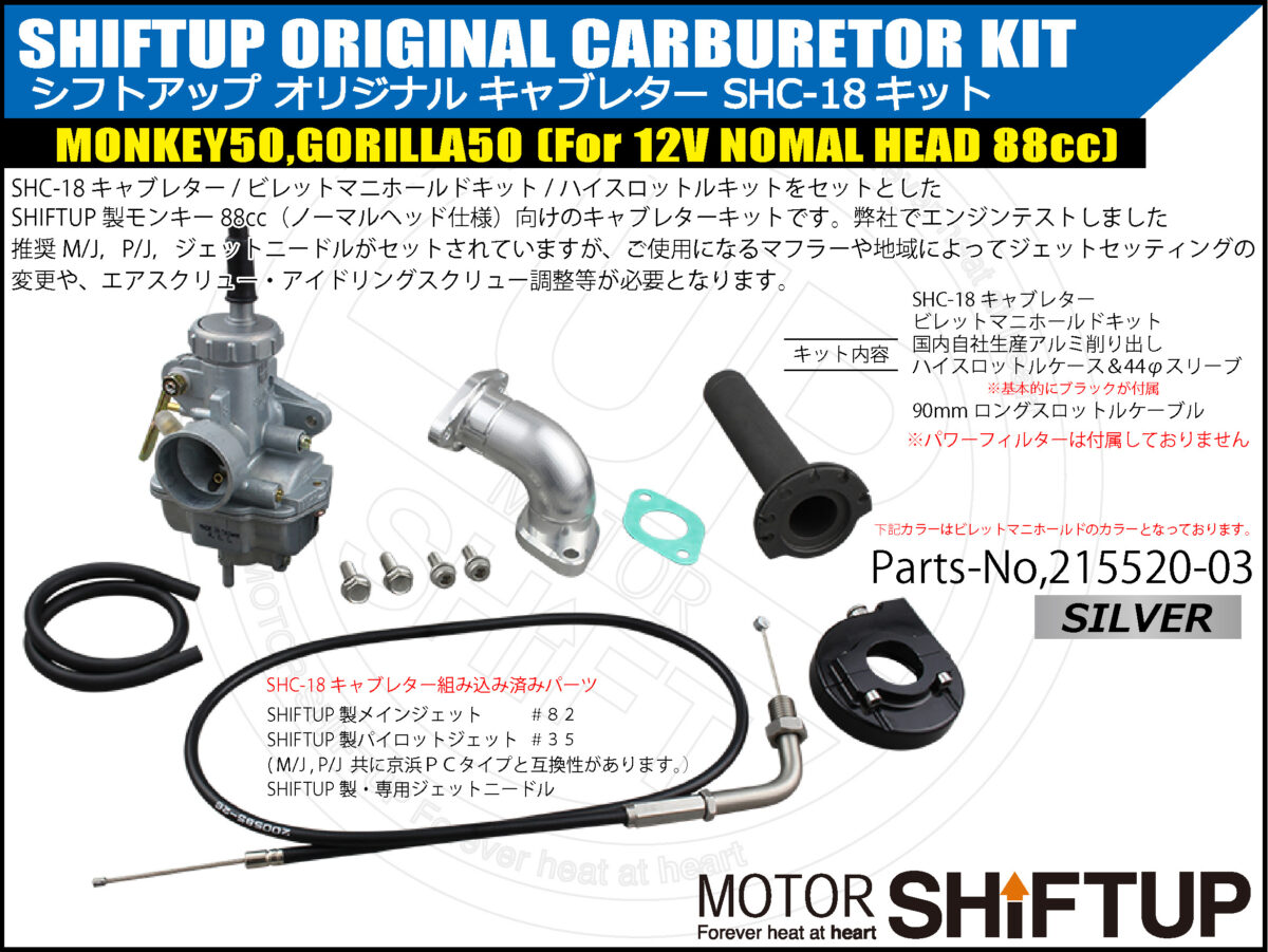 SHIFTUP 製 88cc(ノーマルヘッド仕様)向けのキャブレターキットです。弊社でエンジンテストしました推奨M/J,P/J,ジェットニードルがセットされていますが、ご使用になるマフラーや地域によってジェットセッティングの変更や、エアスクリュー・アイドリングスクリュー調整等が必要となります。