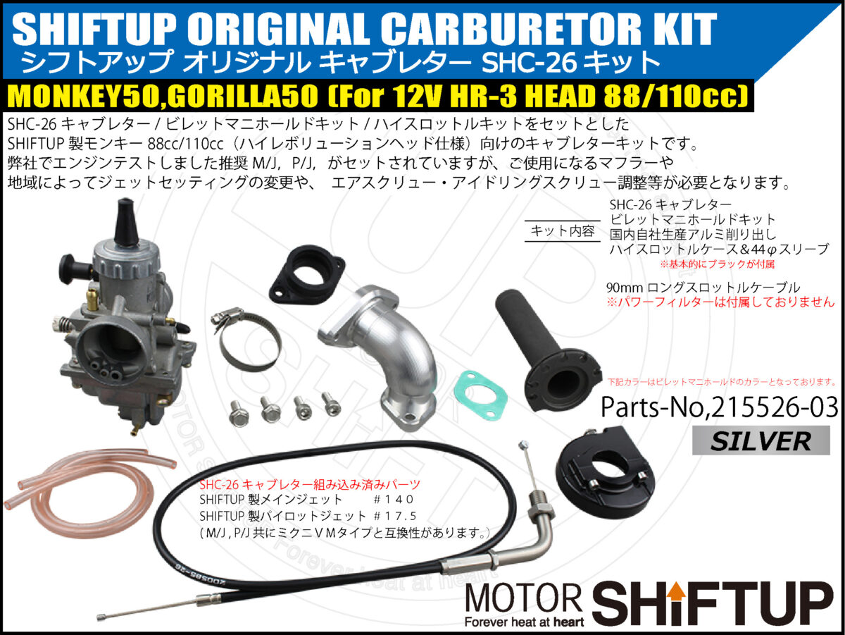 SHIFTUP 製 モンキー 88cc / 110㏄(ハイレボリューションヘッド仕様)向けのキャブレターキットです。