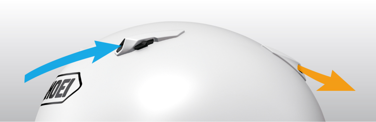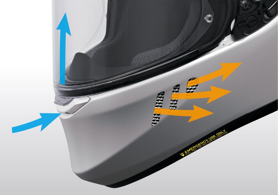 ロアエアインテークから取り込まれた走行風は、シールド内側に導入されデフロスターとして機能。シールドの曇りを取り除きます。