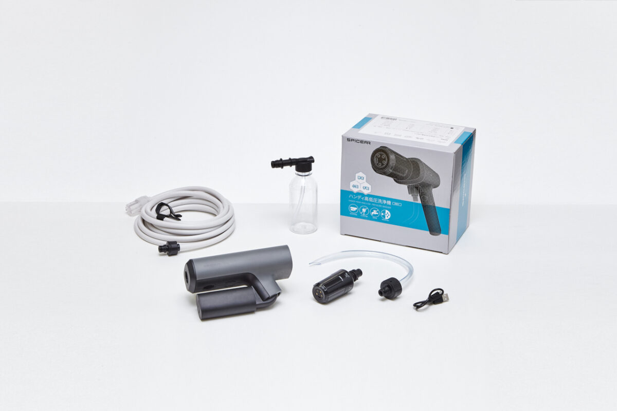 SPICERR「ポケッタブル高圧洗浄機 SWU-1」は、業界最軽量・最小クラス※1(約800g、176mm×104mm※折りたたみ時)で、3段階の圧力・5つの可変ノズルが特徴です。当製品は、噴出ノズルも短く小回りが効くため、バイクや車などの洗車だけでなく、身の回りのちょっとした汚れを落とすのにも利用できる洗浄機です。面倒なセッティングもなく使えるので、浴室やシンク周り、網戸の洗浄まで準備いらずで、ボタン1つで毎日手軽に扱えます。