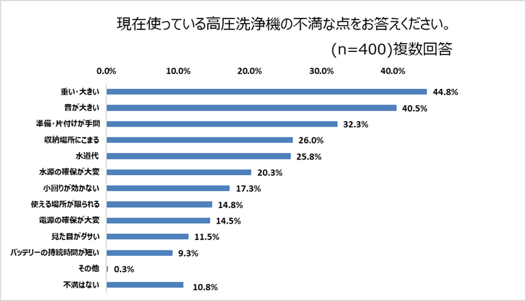 重い・大きい(44.8%)、音が大きい(40.5%)、準備・片付けが手間(32.3%)、収納場所にこまる(26.0%)、水道代(25.8%)