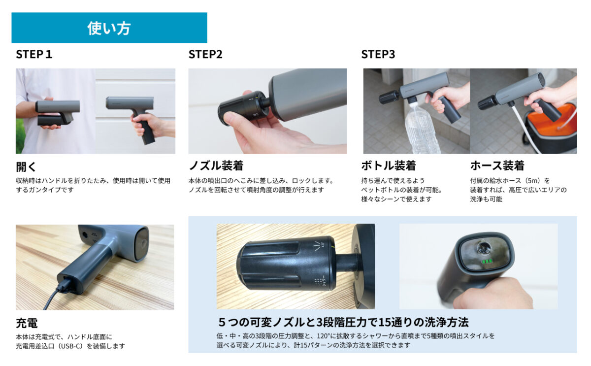 SPICERR「ポケッタブル高圧洗浄機 SWU-1」はわずか3ステップ。3分もあれば洗浄を始められます。ボタンが1つしかないシンプル構造なので、初めて触る人でも手軽に扱えます。