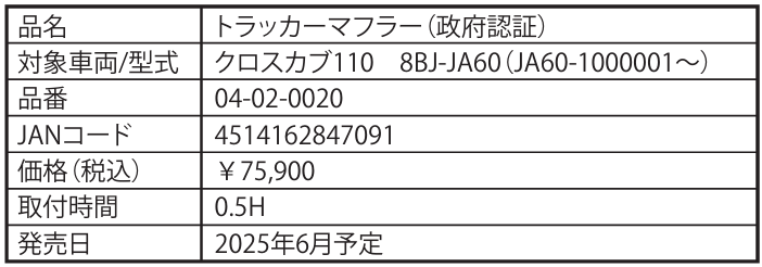 株式会社スペシャルパーツ武川は、クロスカブ110(JA60)専用の新作「トラッカーマフラー(政府認証)」を発表した。