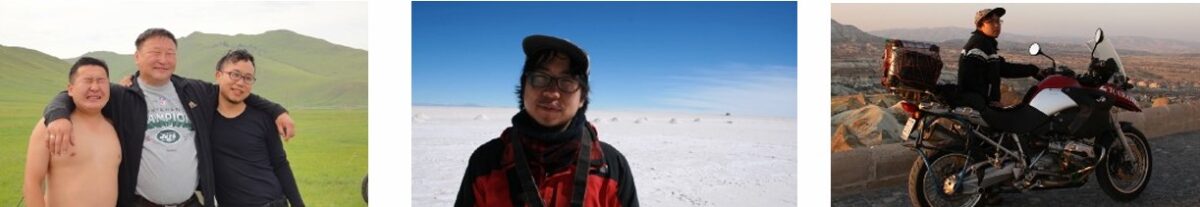 茨城の山の中で育つ。物心つく頃から、じーちゃんのカブの荷台に乗ってオフロードを走っていた。そこからの流れる景色が初めての冒険の記憶。じーちゃんのバイクで遠出した先の田んぼでじーちゃんが死んでしまう。炎天下の山の中、3歳ナメ少年はこのままだと死ぬと思い家路を戻る。何度も振り返りみた、入道雲とバイクの風景が今でも鮮明に思い出せる。山の中を走りまわって幼少期を過ごす。田舎で映画館がなかったので、悪ガキどもと図書館のビデオブースにかじり付いて爆音で「スタンドバイミー」を観て、これがしたいと思う。東京に出て映画をつくる仕事を始める。仕事の合間でテントを積んでバイク旅~。そんな時、アユミと出会い、インドア派の彼女をムリくりバイク旅に連れ出していく。アユミの夢に乗っかりバイクで世界を周る二人の旅を探すことに。