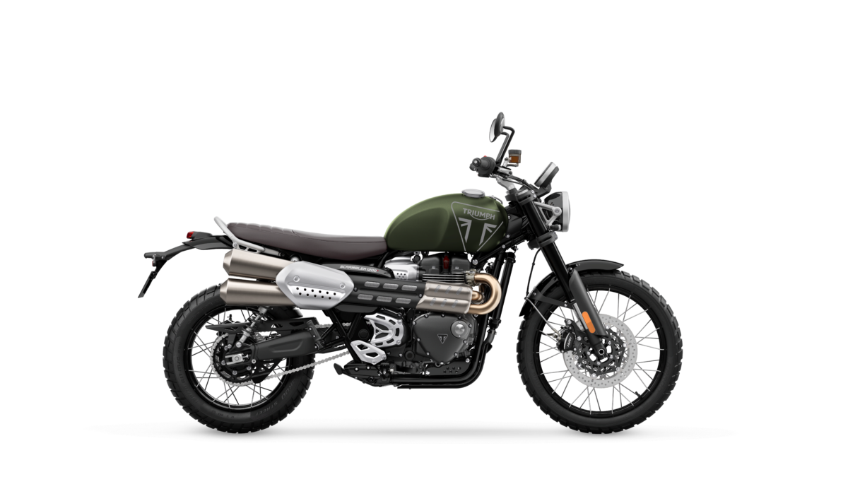 冒険心あふれるSCRAMBLER 1200 Xは、トライアンフの象徴であるマットカーキグリーンのカラーリングを採用したタンクを設定。ファントムブラックのヘッドライトボウル、サイドパネル、マッドガードによって、ミリタリーを彷彿とさせる無骨で力強いデザインを実現しました。
