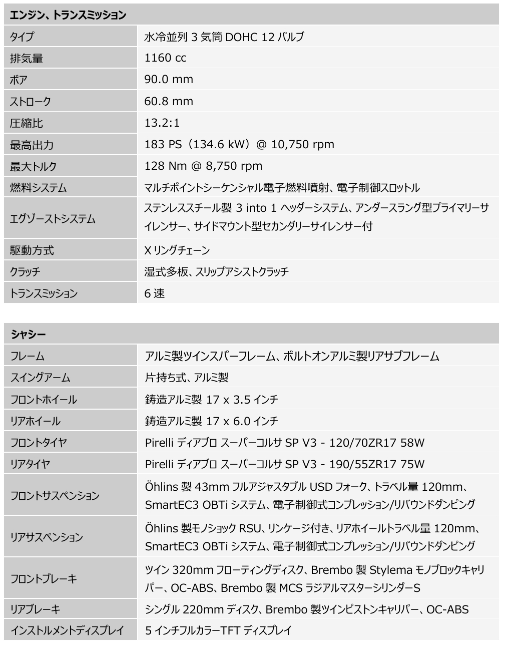 同モデルは、183PS/10,750rpm、128Nm/8,750rpmを発揮するパワフルな1160cc三気筒エンジンを搭載している。また、オーリンズ製の新世代Smart EC3セミアクティブサスペンションを搭載したことにより、コーナーでの圧倒的な鋭いハンドリングや俊敏性、コントロール性を発揮するのも特徴だ。カラーリングは3色展開で、2025年4月より正規販売店にて販売開始予定となっている。