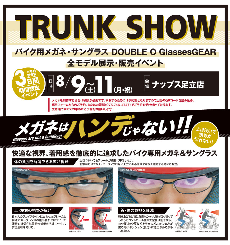 この度、バイク専用メガネの体験ができるイベント、「TRUNK SHOW」が下記にて開催される事となった。