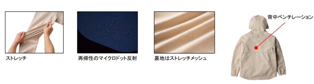 機能:裾調節可、高撥水、防水、背中ベンチレーションメッシュ、裏メッシュ、反射材付き、2WAY ストレッチ、防風耐水圧 10,000 ㎜、透湿度 20,000g/㎡/24h