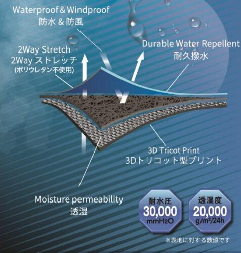 耐水圧 30,000 ㎜、透湿度 20,000g/㎡/24h