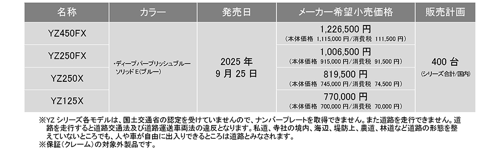 ヤマハ発動機販売株式会社は、クロスカントリー競技用「YZシリーズ」2026年モデルを2025年9月25日に発売する。