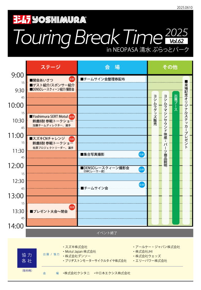 株式会社ヨシムラジャパンは、2025年6月21日(土)に「ツーリングブレイクタイム 鈴鹿8耐直前スペシャル」をNEOPASA清水で開催すると発表した。