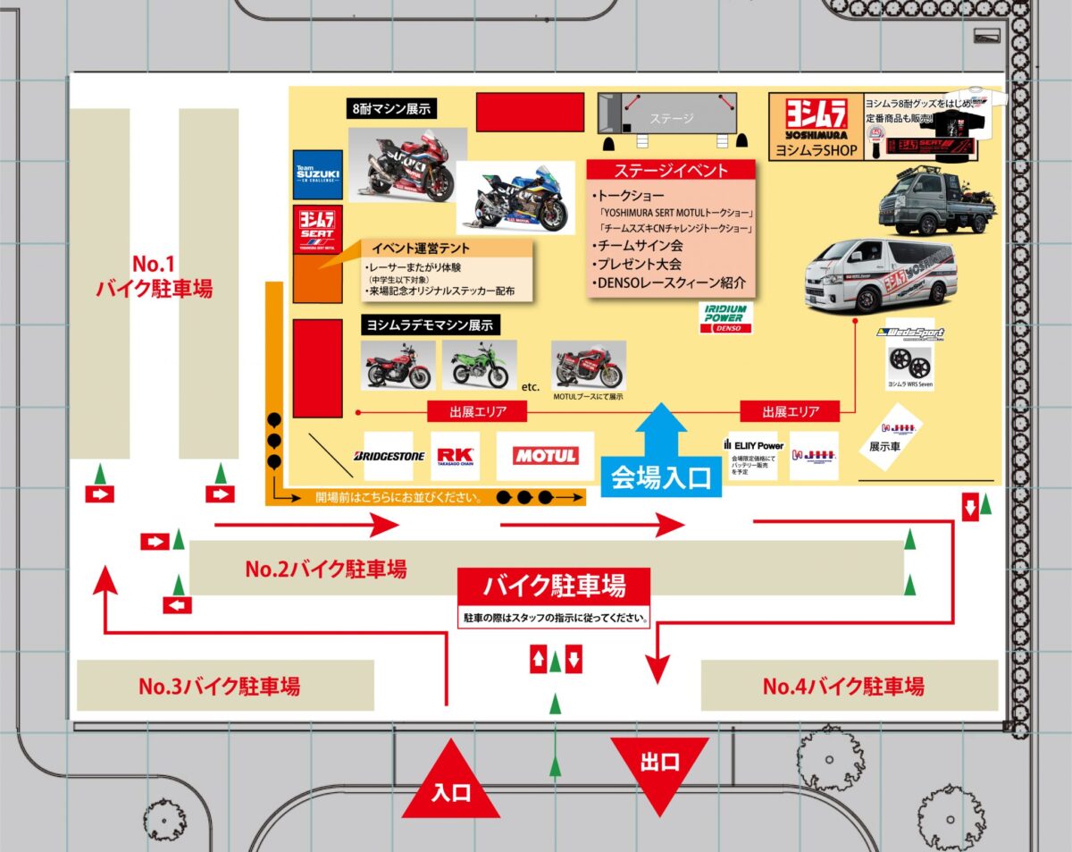 ・ヨシムラツーリングブレイクタイムには、多くの方にご来場いただきます。来場者の皆さまがルールやマナーを守り、お互いに譲り合いの気持ちを持ってお楽しみいただけますよう、ご協力をお願いいたします。