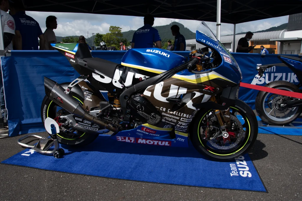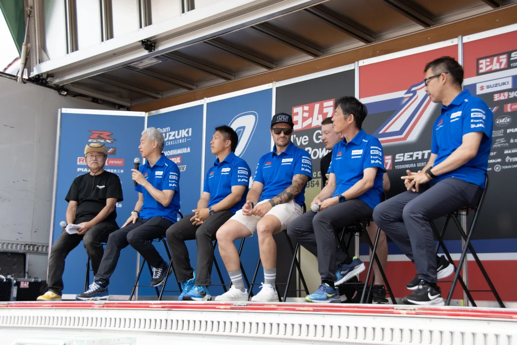 続いて、「チームスズキCNチャレンジトークショー」では、佐原プロジェクトリーダー、エティエンヌ・マッソン選手、津田拓也選手、チームメンバーの今野氏、田村氏が登壇。スズキファクトリーとしてレースを継続するためCN(カーボンニュートラル)の挑戦を継続する意義や、SUZUKI勢としてレースを盛り上げ、昨年以上の結果を目指す意気込みが語られました。カテゴリーは異なるものの、ヨシムラのパッケージでの仕様はライダーからの信頼性もあり心強いと発言。さらに第3ライダーの発表もあり、会場は大いに盛り上がりました。