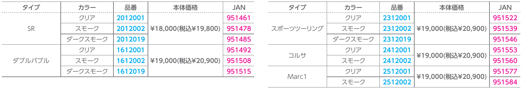 同製品は、ブローモールド製法で歪みの無いクリアな視界が特徴のスクリーンとなり、SR、ダブルバブル、スポーツツーリング、コルサ、Marc1の5タイプを展開している。価格は19,800円(税込)から。自分好みのデザインを見つけて、愛車とのツーリングをより快適に楽しんでみてはいかがだろうか。