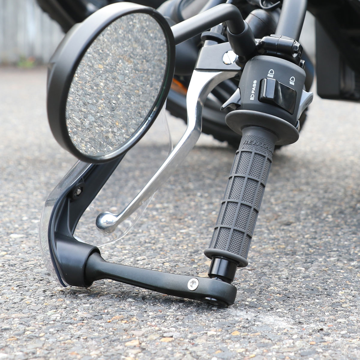 街に溶け込むスタイリッシュなデザインを採用したバーエンド固定式のハンドガード。プロテクターにはポリカーボネートを使用し、スッキリとした印象を与えつつ、優れた防風性能を発揮する。取付けは純正ハンドルバーエンドにM8ボルトで固定するだけの簡単装着。