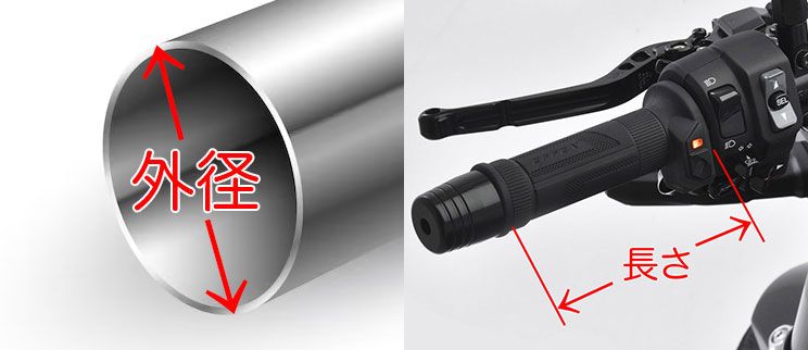 ご自身のバイクに適合する製品がなく、汎用品を選ぶ場合は、購入前にハンドルの外径とグリップの長さを必ず測りましょう。サイズが合わない製品は装着できなかったり、操作時に違和感が出たりする可能性があります。グリップが太くなると握りづらくなるため、できるだけ従来のグリップに近い外径の製品を選びましょう。