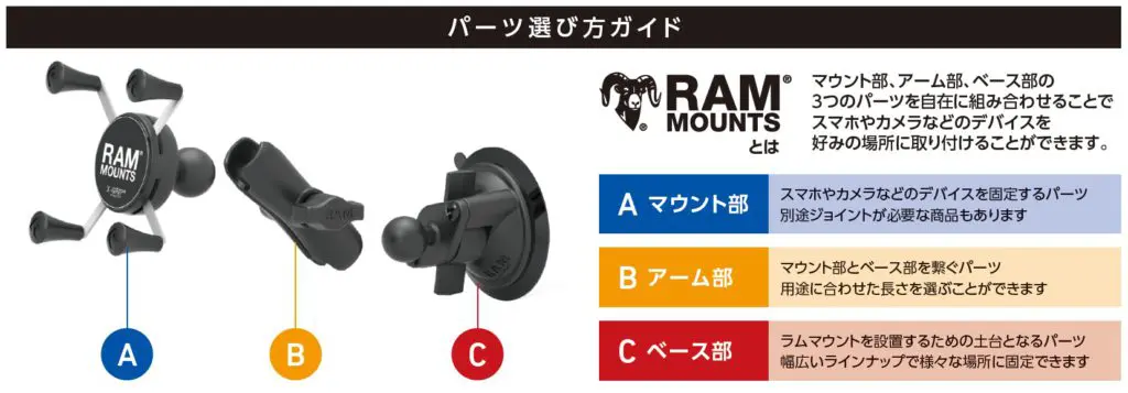 ラムマウントの魅力の一つである豊富なパーツラインナップ。色々なパーツの組み合わせでスマホでもカメラでもタブレットでも何でも、バイクだったり車だったり自転車だったりはたまた家の中で使ってみたり、何でもできちゃうラムマウントですが多すぎてどれを買えばいいのか分からない!という方、バイクにスマホを取り付けるには基本的に三種類のパーツがあれば大丈夫です。