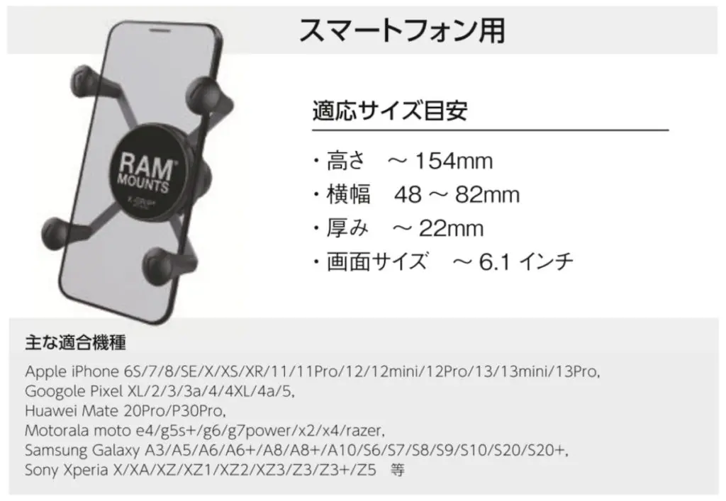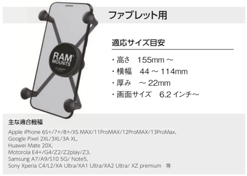 6.2インチ以上の大画面スマホ向け、と言っても最近のスマホは大画面のものが多いので新しめの機種の大半はこのサイズがピッタリのことが多いです。大体ですがスマホの縦の長さが15cm以下だとXグリップのツメのかかりが浅くて不安定な感じがするので、「前使ってた古いスマホをテザリングでナビにする」という使い方をしている人は、サイズによっては上手くホールドできないことがありますのでチェックしてみて下さい。