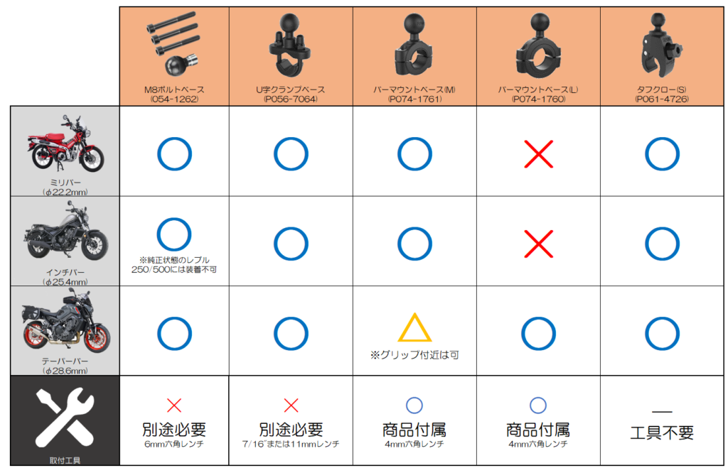 さて最後は一番選択肢の多いベース部の選び方、自分のバイクにはどれが付くの?という方に厳選したパーツをご紹介します。