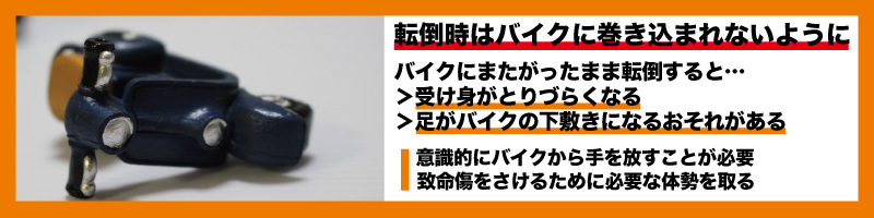 バイクにまたがったまま転倒すると、体勢が制約されて受け身がとりづらくなるほか、足などがバイクの下敷きになる危険性が高まります。