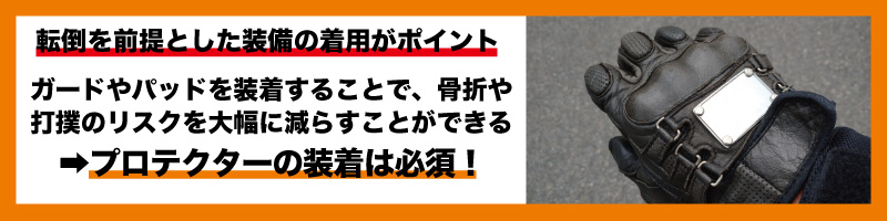 このほか、プロテクターの装着も転倒時のダメージを軽減するのに効果的な装備です。