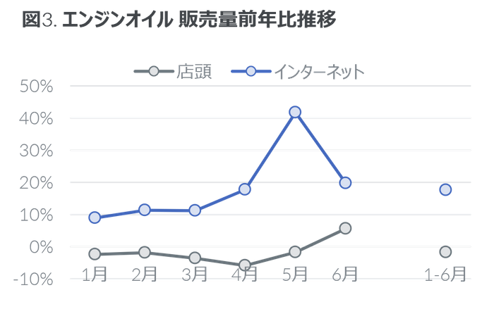 4L缶は数量前年比1%減であったが、インターネットでは同2%増と微増であった。店頭は4L缶全体では同2%減と落ち込んだなか、全合成油は同4%増と伸長した。平均価格は、店頭では3,611円と前年から横ばいであったことに対して、インターネットでは販売数量の8割を占める全合成油の価格が上昇したことで、前年同期から9%上昇した。結果、インターネットの金額前年比は11%増と二桁成長となった。