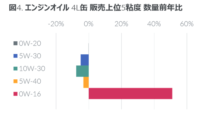 4L缶では0W-20の販売が最も多く、数量ベースで41%を占めた。対して、5W-30の数量構成比は前年同期の23%から22%に、10W-30は15%から14%に縮小した。こうした中、0W-16の販売が好調で数量前年比は51%増に達し(図4)、数量構成比は2%から4%に拡大した。